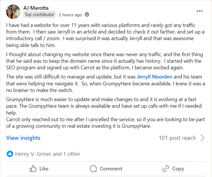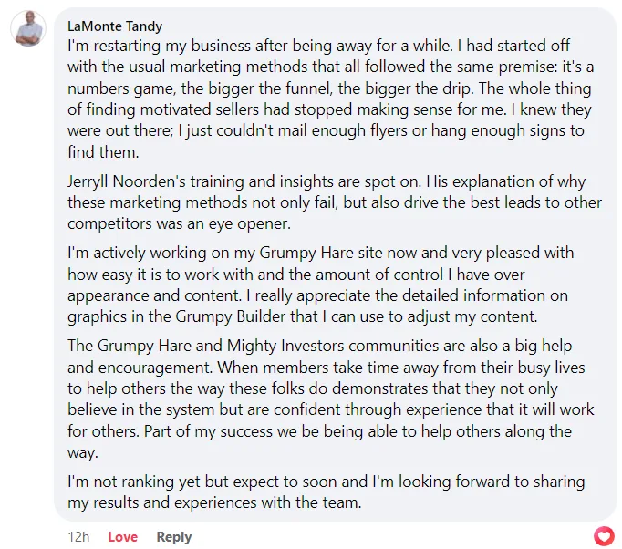 GrumpyHare is where it’s at folks! The GH staff and the entire SEO for REI team has been super hands-on throughout the process of building my website and its been such a smooth process. Don’t get it twisted though… in order to be successful you MUST put in the sweat equity and intimate time into it, but the ease and user-friendliness of the platform definitely keeps you juiced up! This is my first go at utilizing SEO for my business and I am looking forward to making it happen with GH and the SEO community. Let’s get it! Cheers!