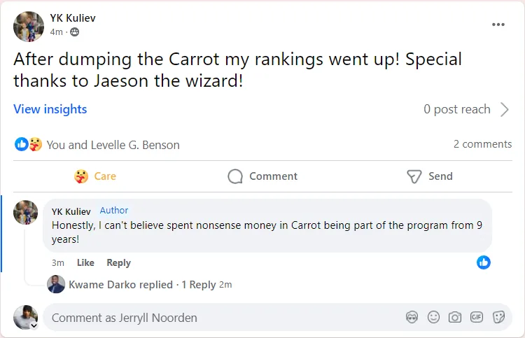 When I implemented the JSEO Credibility pkg on my Carrot site it went from ranking waaaay down the list to consistently on the first page. This shows me that Jerryll Noorden knows what he is doing. I believe he has the ability to provide a superior website template as well. For that reason my plan is to leverage his proven knowledge and make the swap from Carrot over to GrumpyHare. Plus I don’t have the brain space to do what he has already done…lol