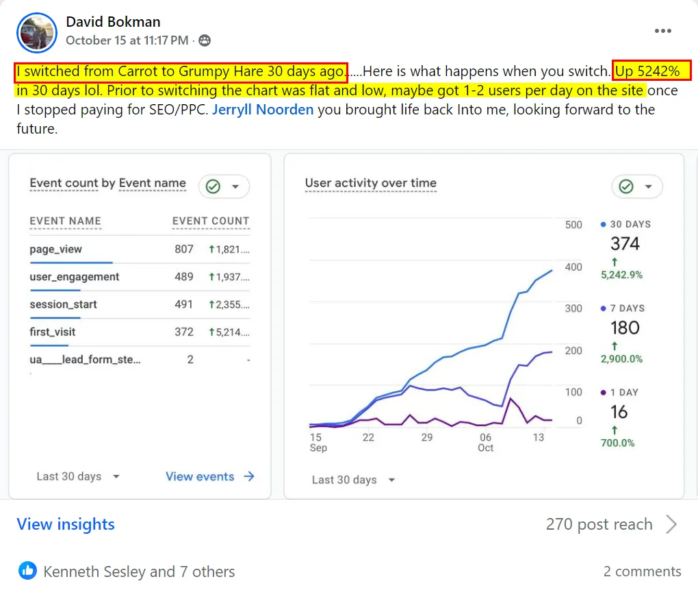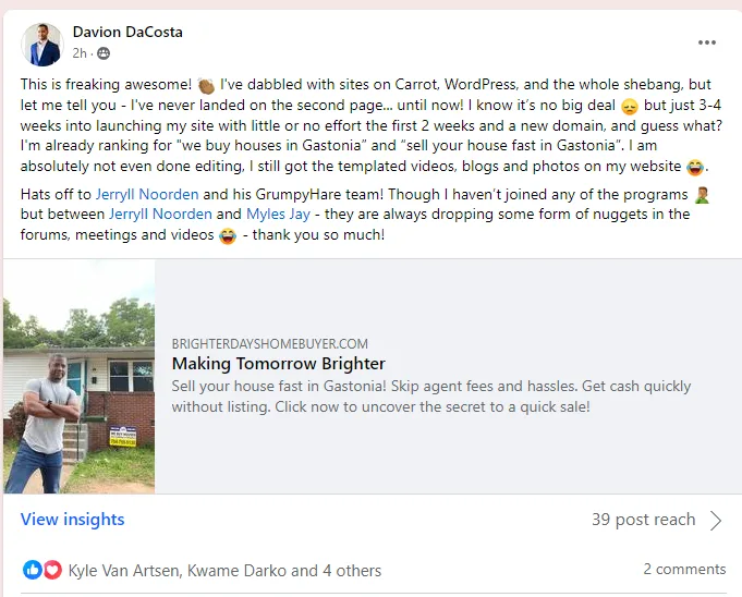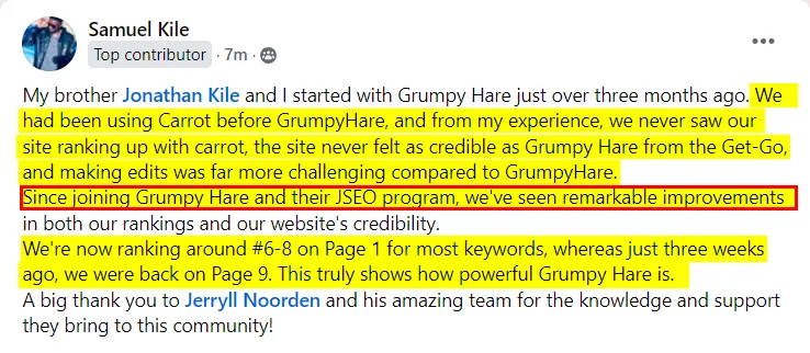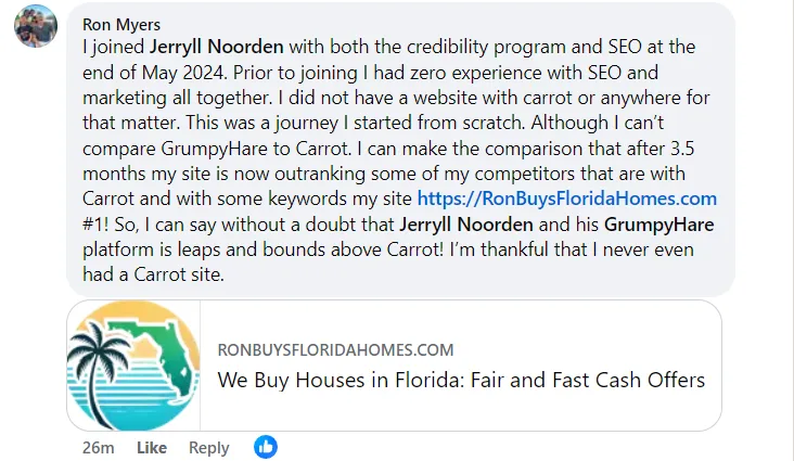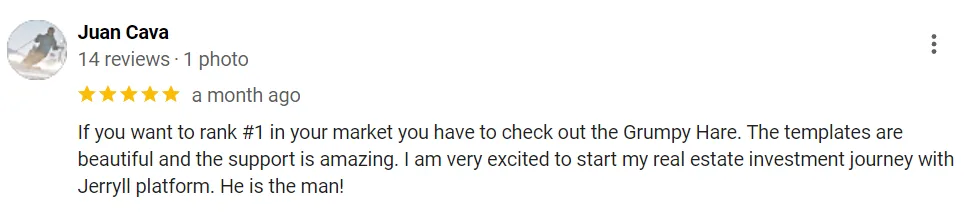 “Dude Jerryll ever since I joined GrumpyHare I am ranking even higher for alot of keywords i never ranked for. I am now #1 for “sell my house in san bernardino” I never reached that with carrot. Dude I am so glad you created this new platform man. I am ranking 1# for almost every Keyword! and thats not even all the words I am ranking for!!!”